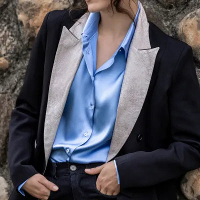 Entre la rigueur du noir et la délicatesse du suède, cette veste évoque un équilibre parfait. Une allure qui mêle allure intemporelle et audace contemporaine, pour celles qui avancent avec assurance.