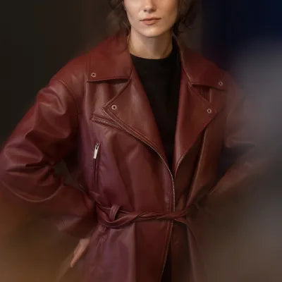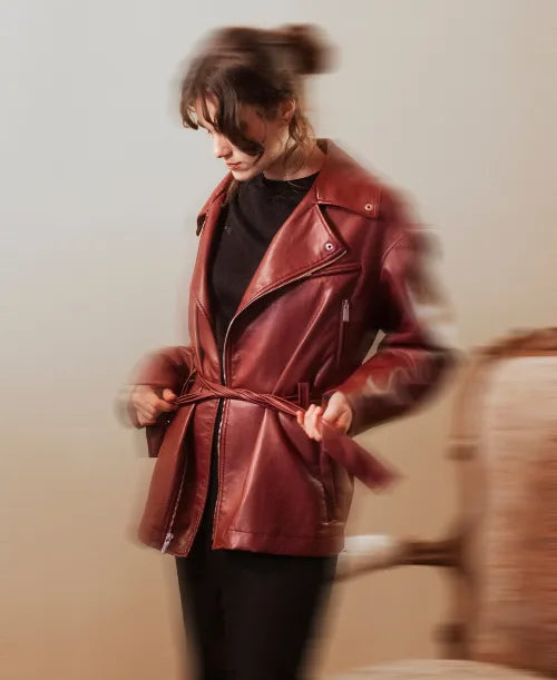 La Veste en Simili Cuir Bordeaux célèbre les contrastes de la saison. Sous sa lumière feutrée, le cuir s’assouplit et révèle la force tranquille d'une femme libre, passionnée, indomptable.