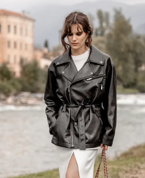 Pensée pour celles qui avancent entre ombre et lumière, la Veste en Simili Cuir Noire dévoile un caractère affirmé. Entre douceur du cuir et éclat du métal, elle capture l’essence du contraste.