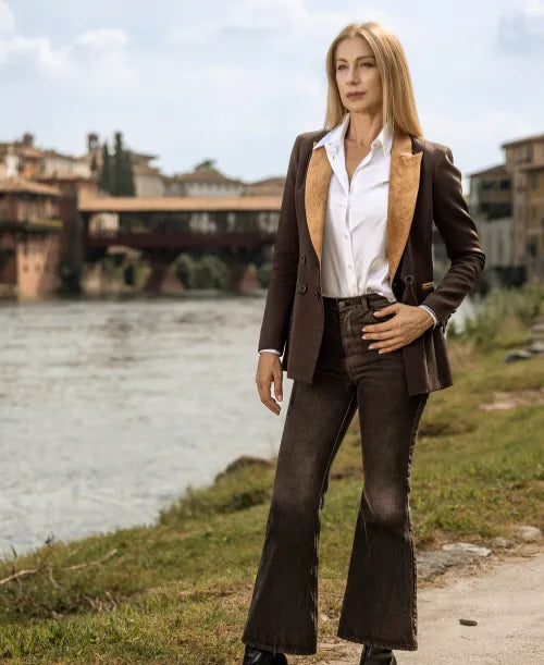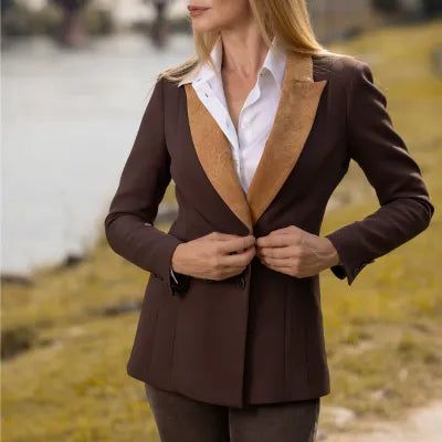 La Veste Marron Croisée capture la lumière dorée des fins de journée. Son col en suède caresse le regard, sa coupe souligne la prestance qui célèbre la force douce et la confiance de la femme moderne.