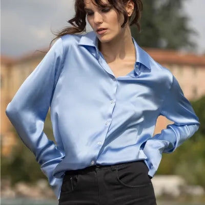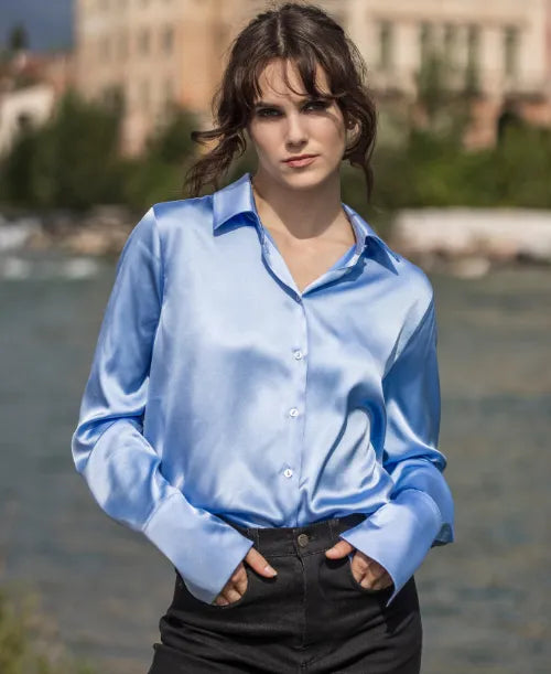 Chemise en soie bleu azur à la brillance subtile et au toucher fluide. Son tissu stretch (93% soie, 7% élasthanne) épouse les mouvements avec légèreté. Les boutons bijoux signent une allure raffinée, idéale pour les tenues d’automne-hiver.