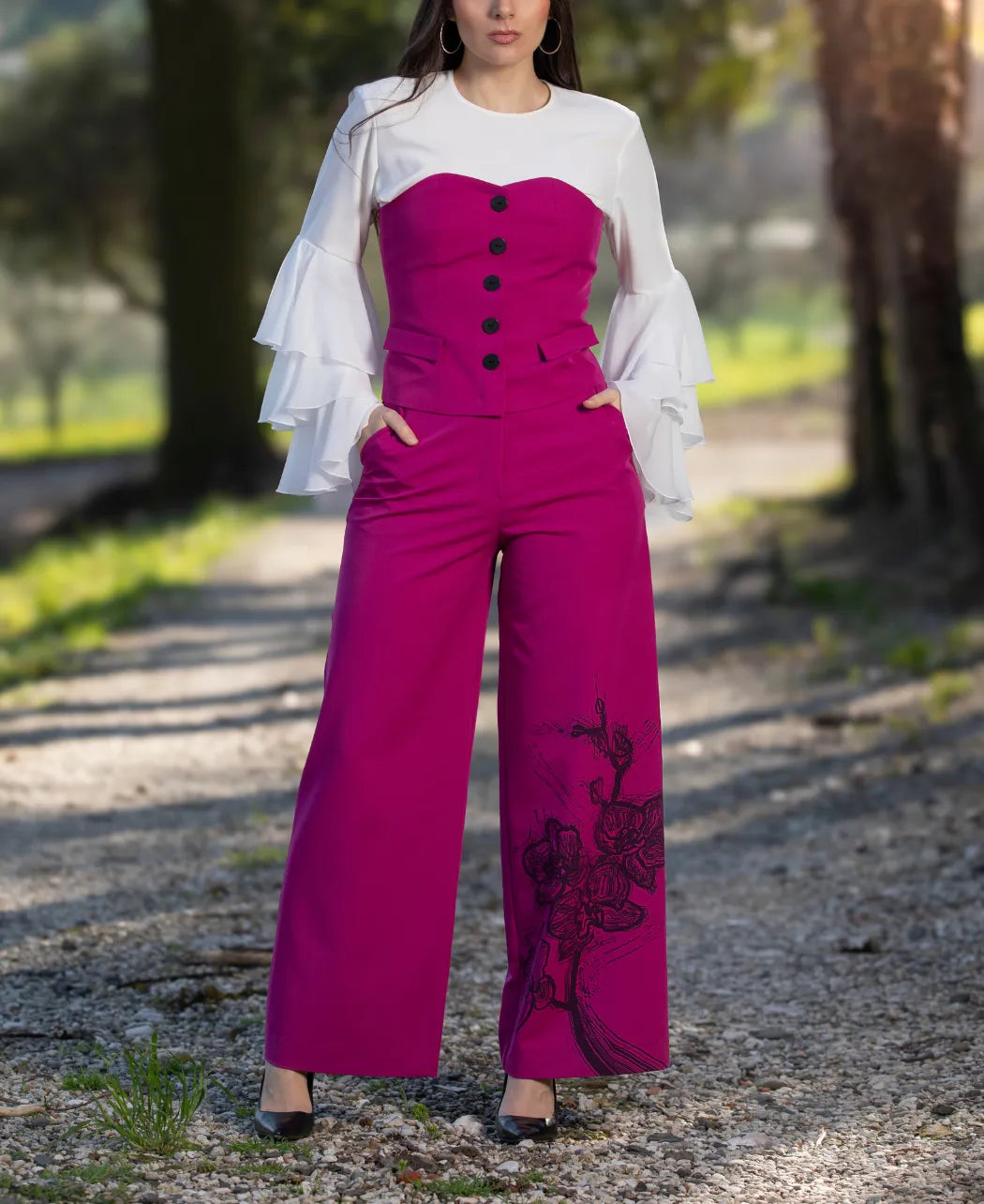 Le Pantalon Éclat d'Orchidée Fuchsia est une pièce hommage, pensé autour de notre motif signature, incarnant une féminité audacieuse, artistique et assumée.