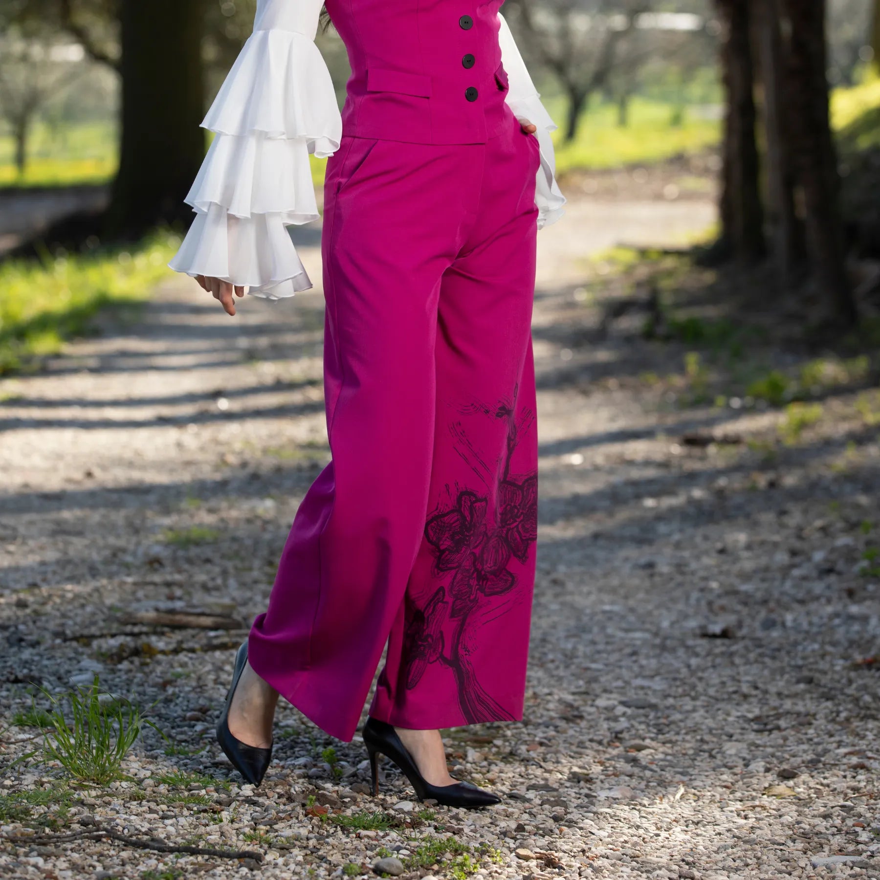 - Imprimé exclusif "Éclat d’Orchidée" sur la jambe gauche, désigné par Chiara Salini.